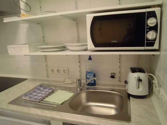kleine Küche mit klappbarem Wandtisch und Stühlen